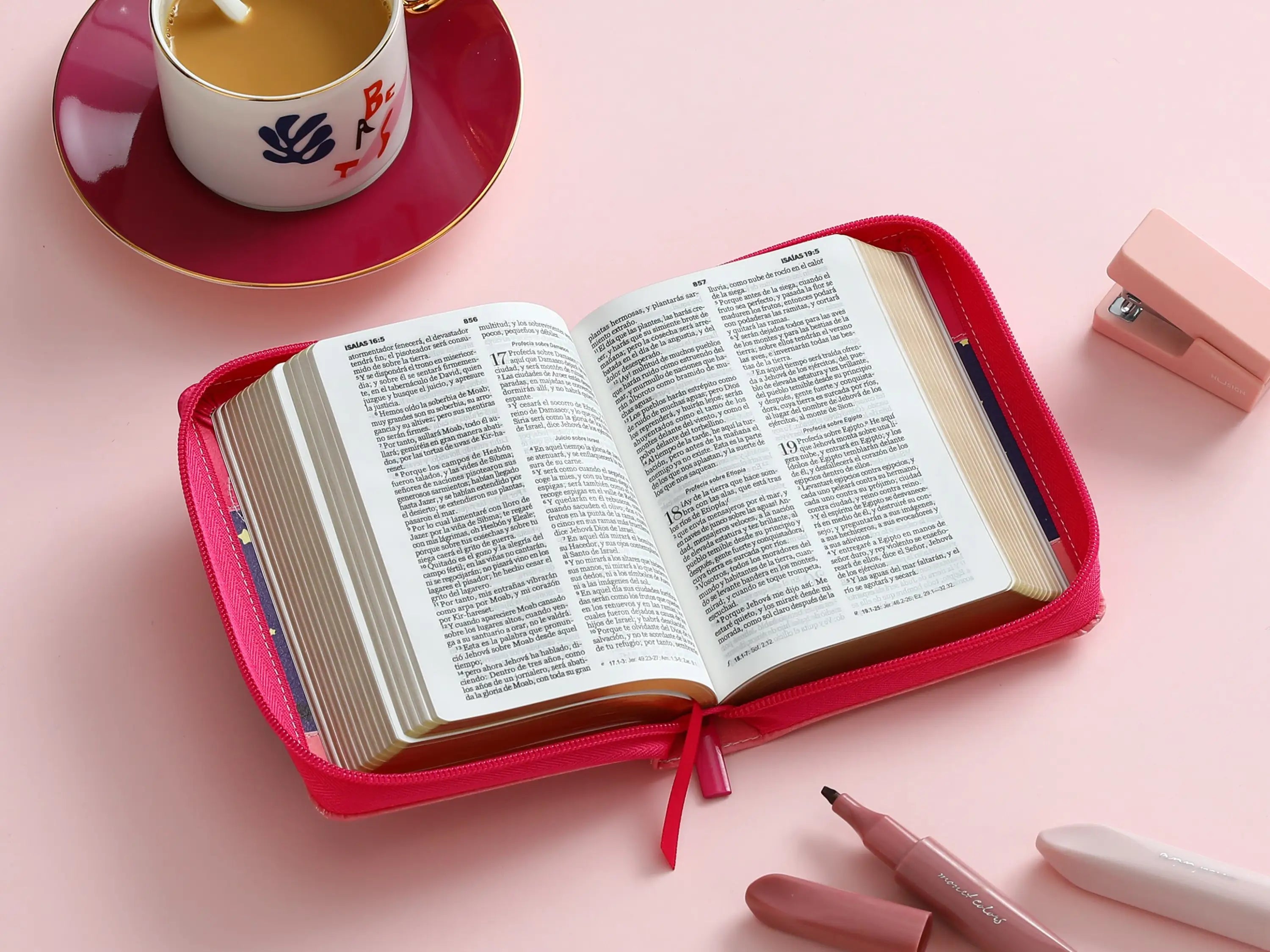 Reina Valera 1960, tamaño bolsillo (100x140 mm), con cierre, palabras de Jesús en rojo. Canto dorado. Concordancia amplia de palabras de la Biblia, concordancia personajes. 32 páginas a todo color con ayudas y esquemas. 12 mapas a todo color .Referencias cruzadas. Letra: 8,5 puntos.