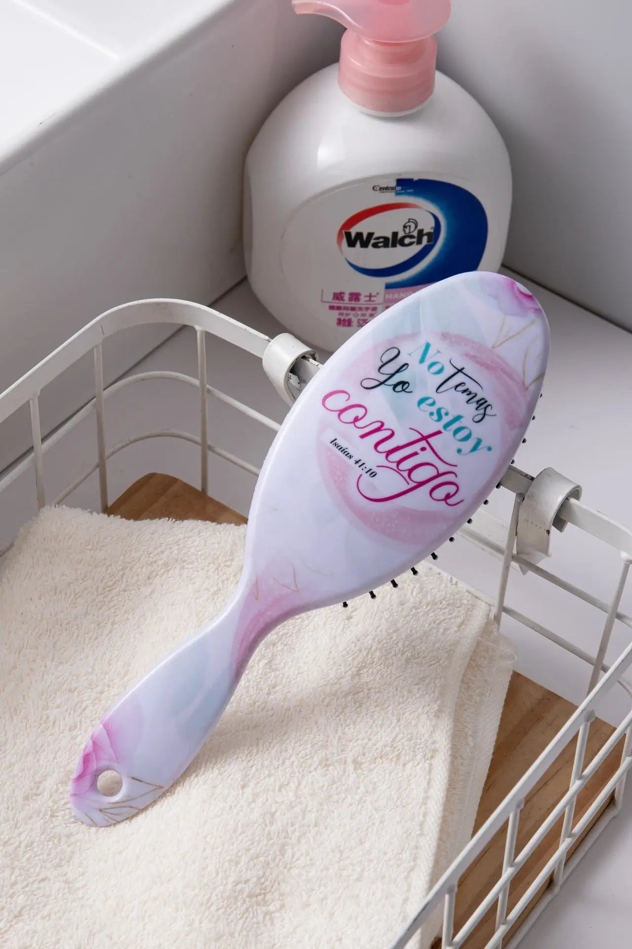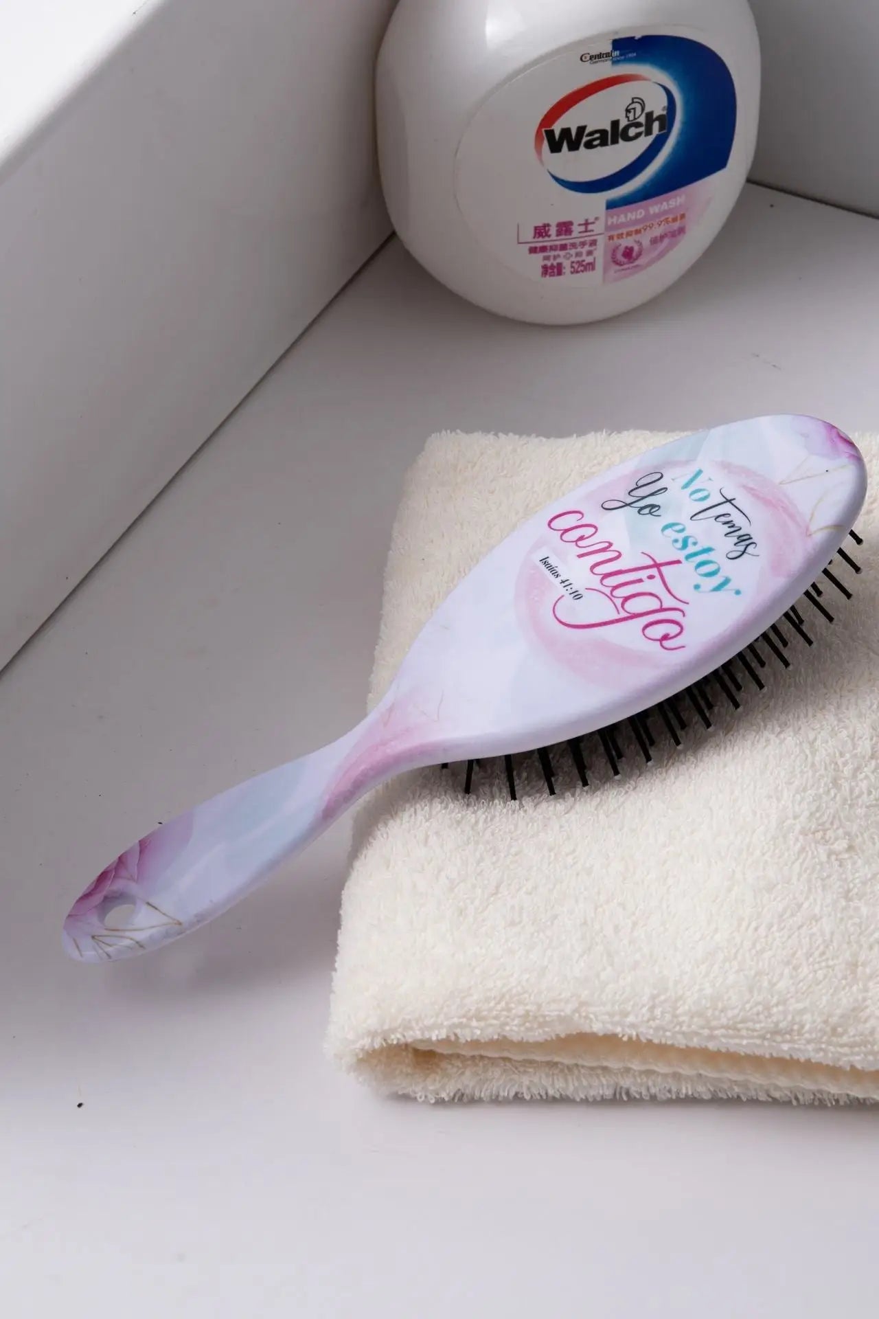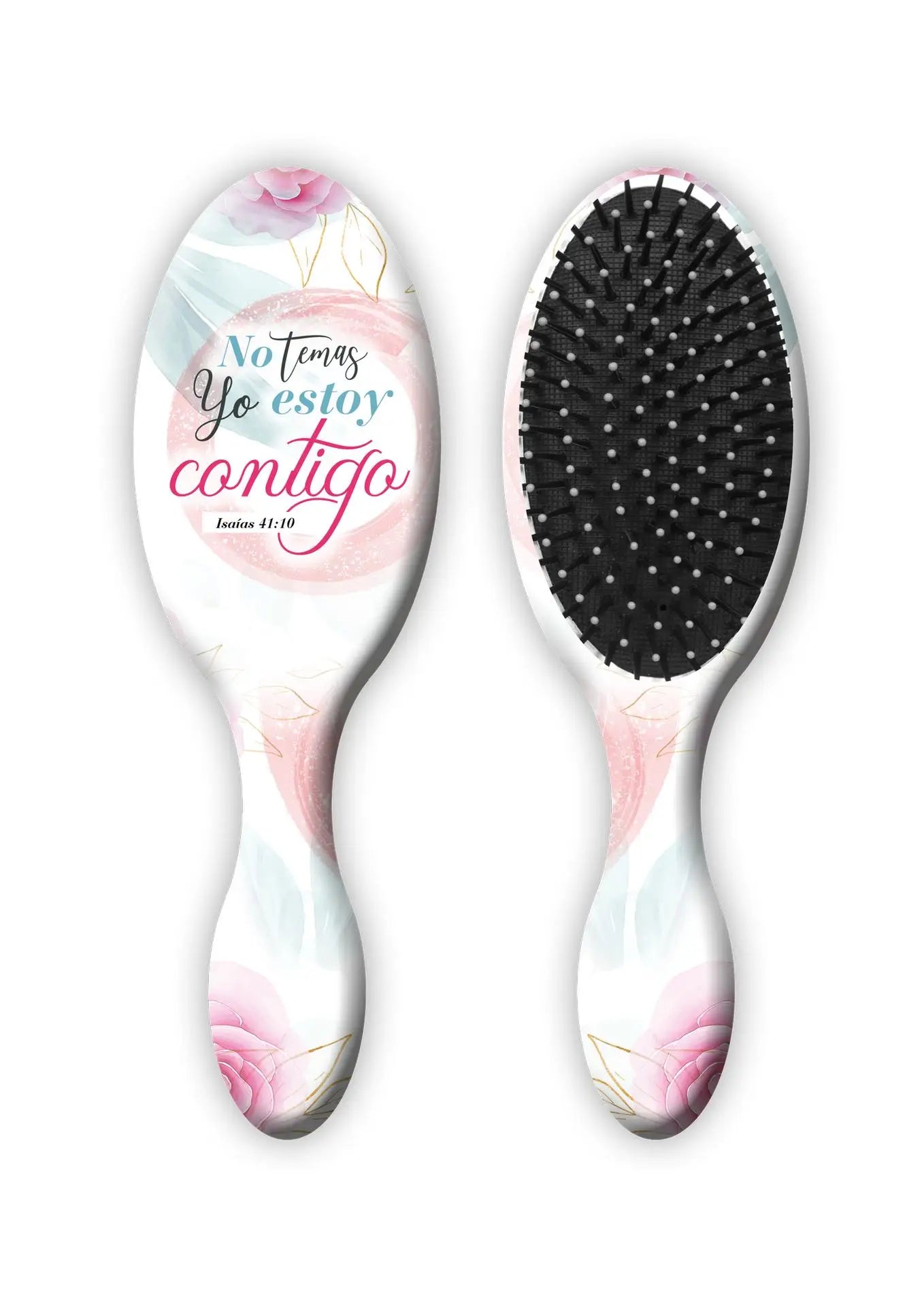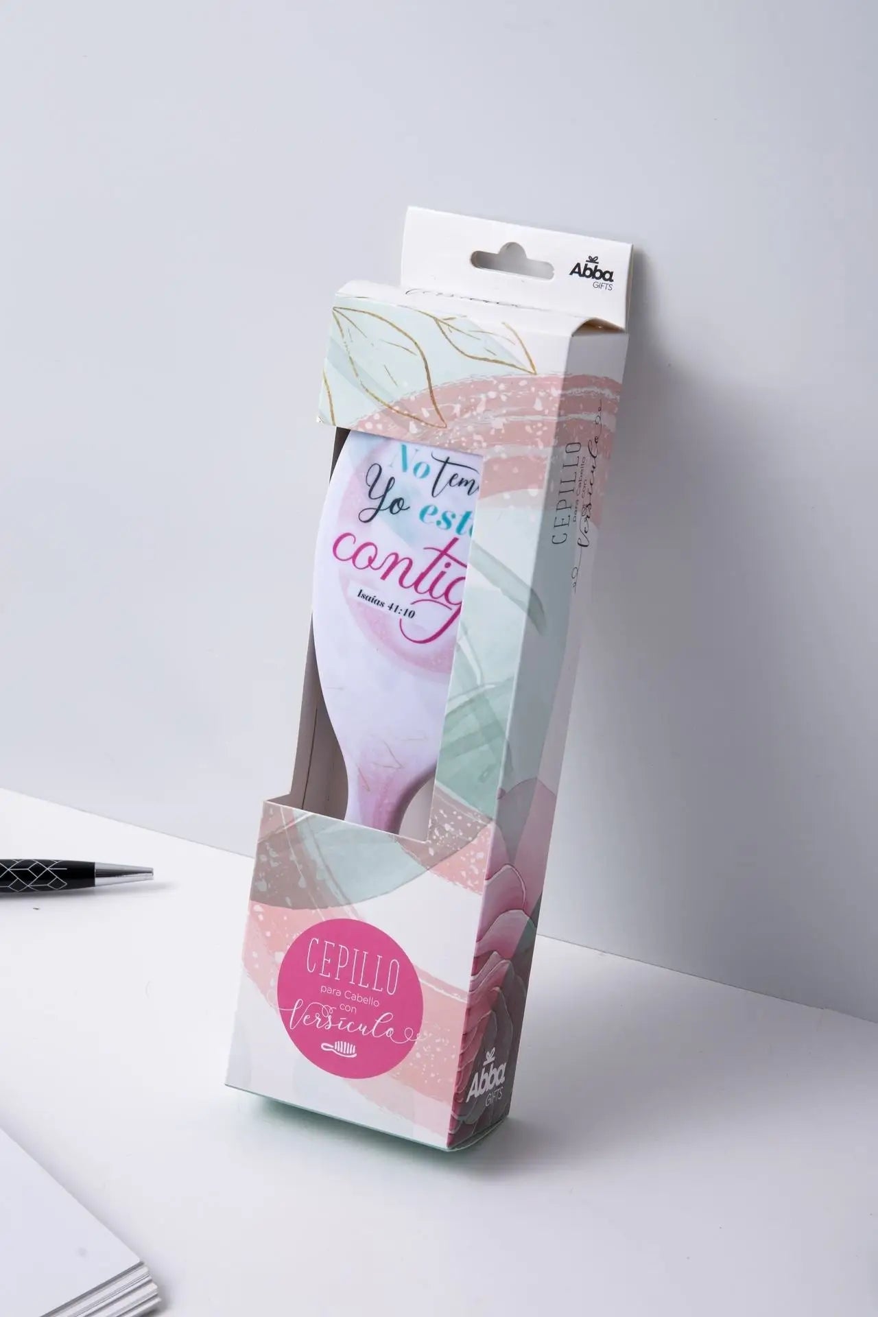 Cepillo de pelo de gran calidad impreso con diseño contemporáneo y un versículo bíblico. Viene empacado en caja de color con ventana. Tamaño: 225x70 mm